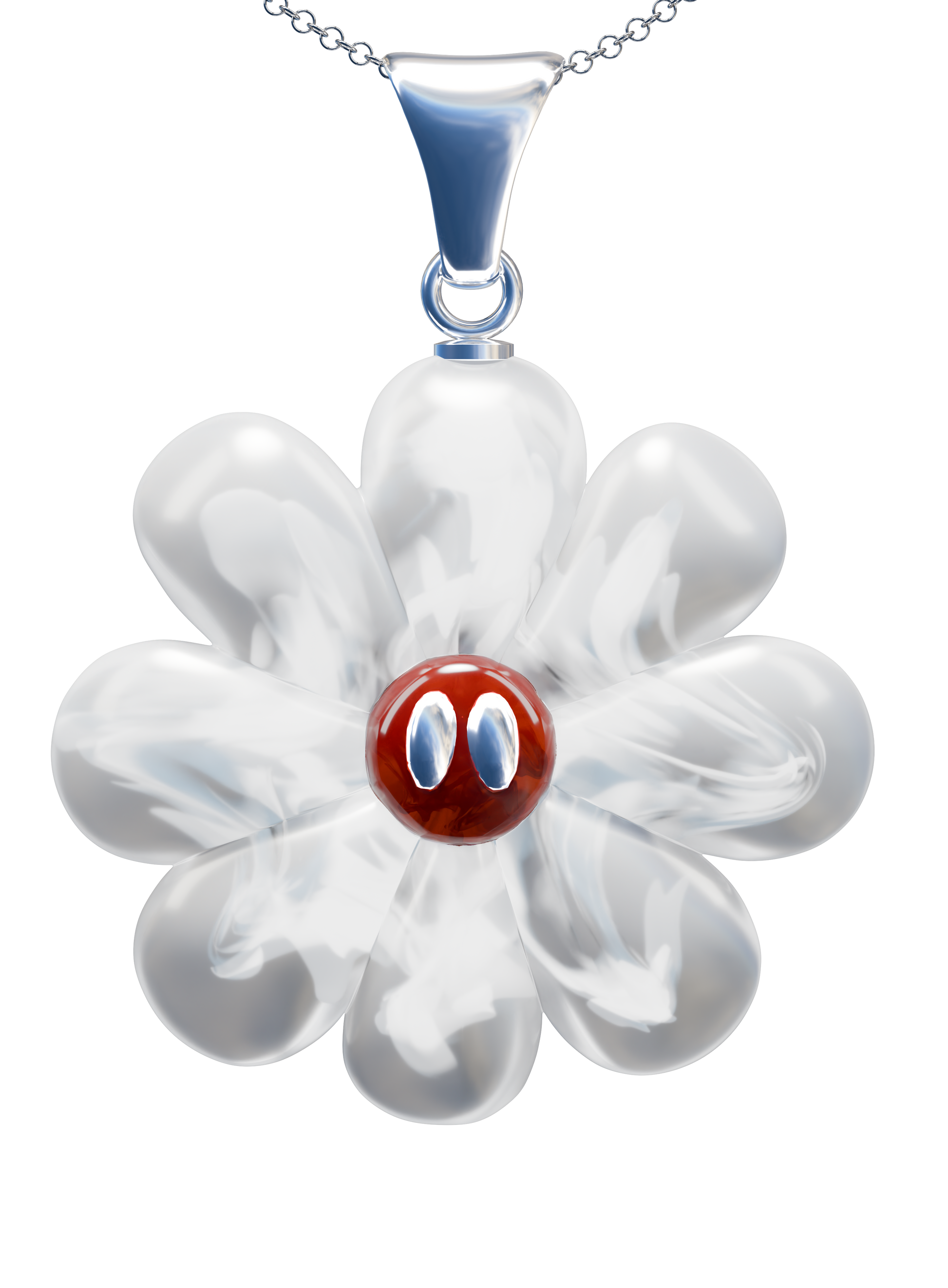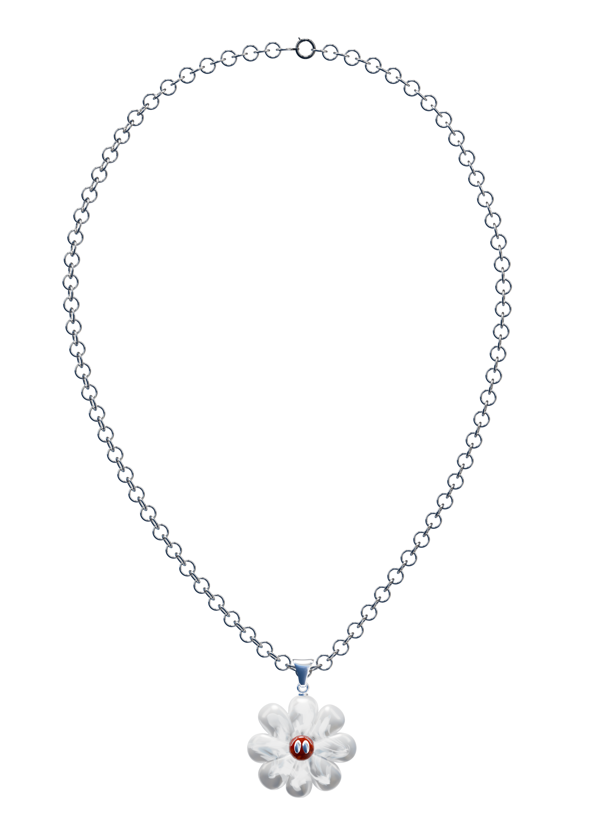 Le collier FLOWER GRUMPI est conçu en argent 925 et composé d'une fleur à l'effigie de la collection GRUMPI, en résine époxy, ornée de paires d'yeux en argent 925.