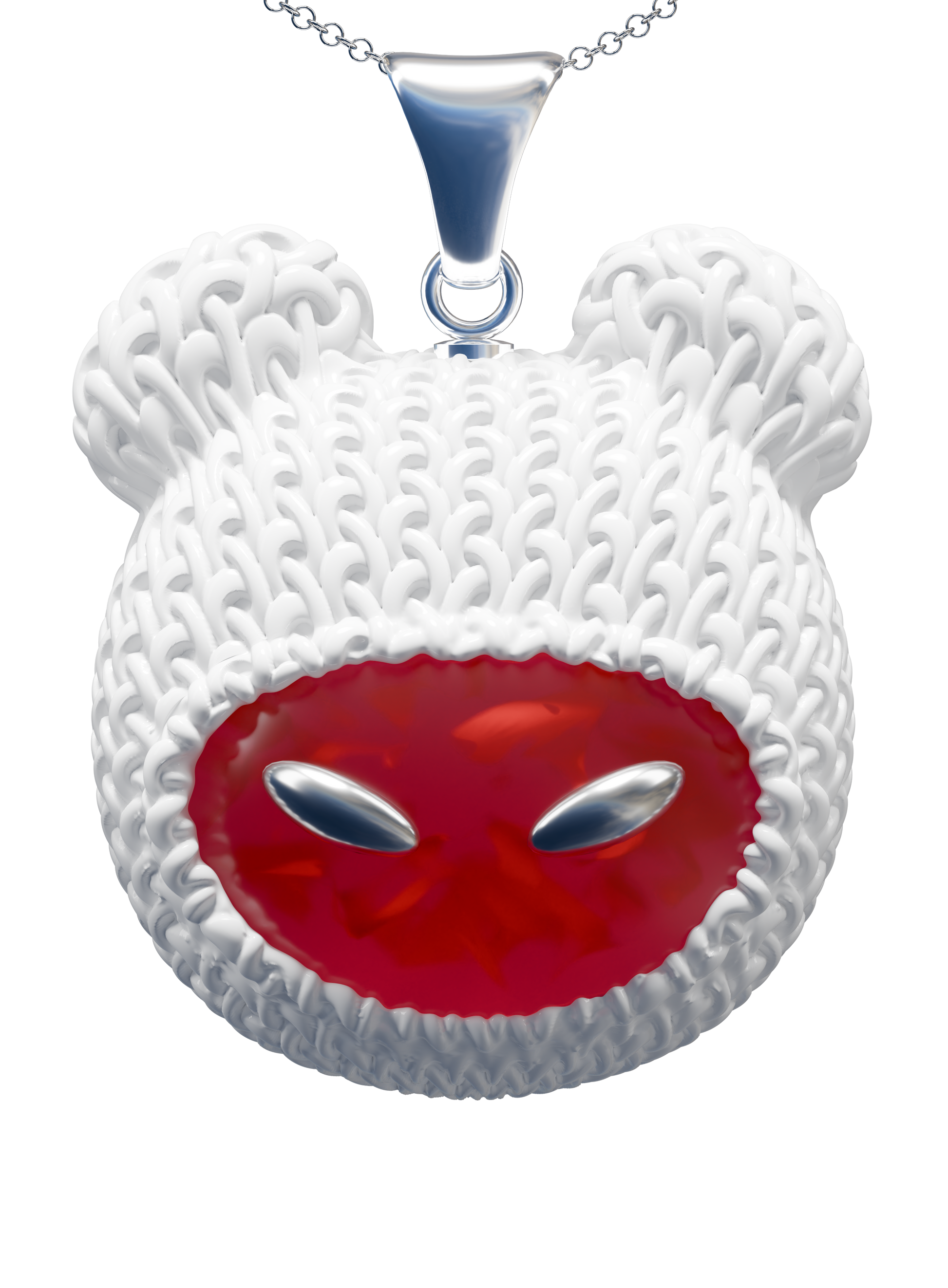 Le collier GRUMPI est conçu en argent 925 et composé d'une de la tête du personnage à l'éffigie de la collection en resine epoxy possèdant des paires de yeux en argent 925.