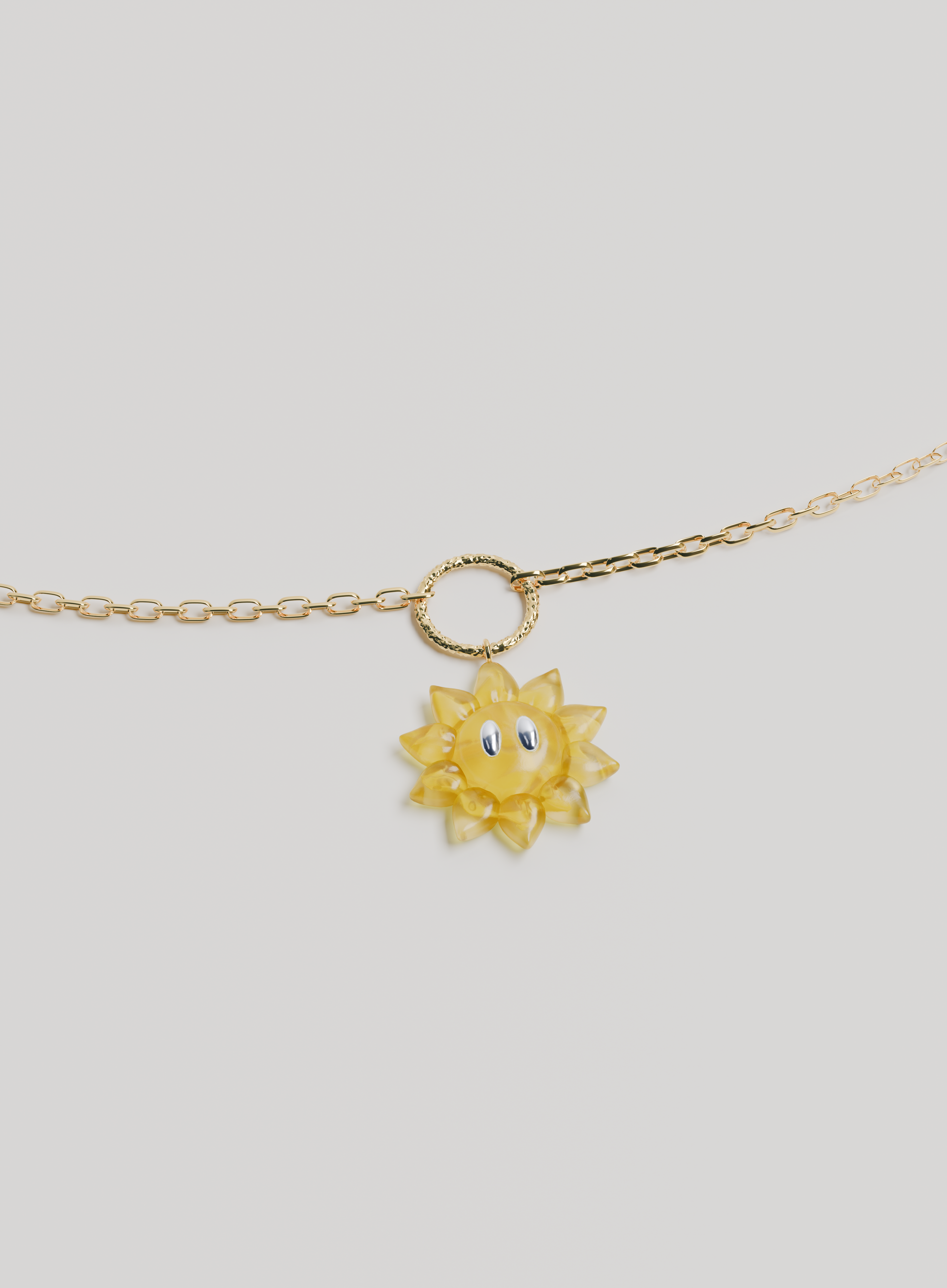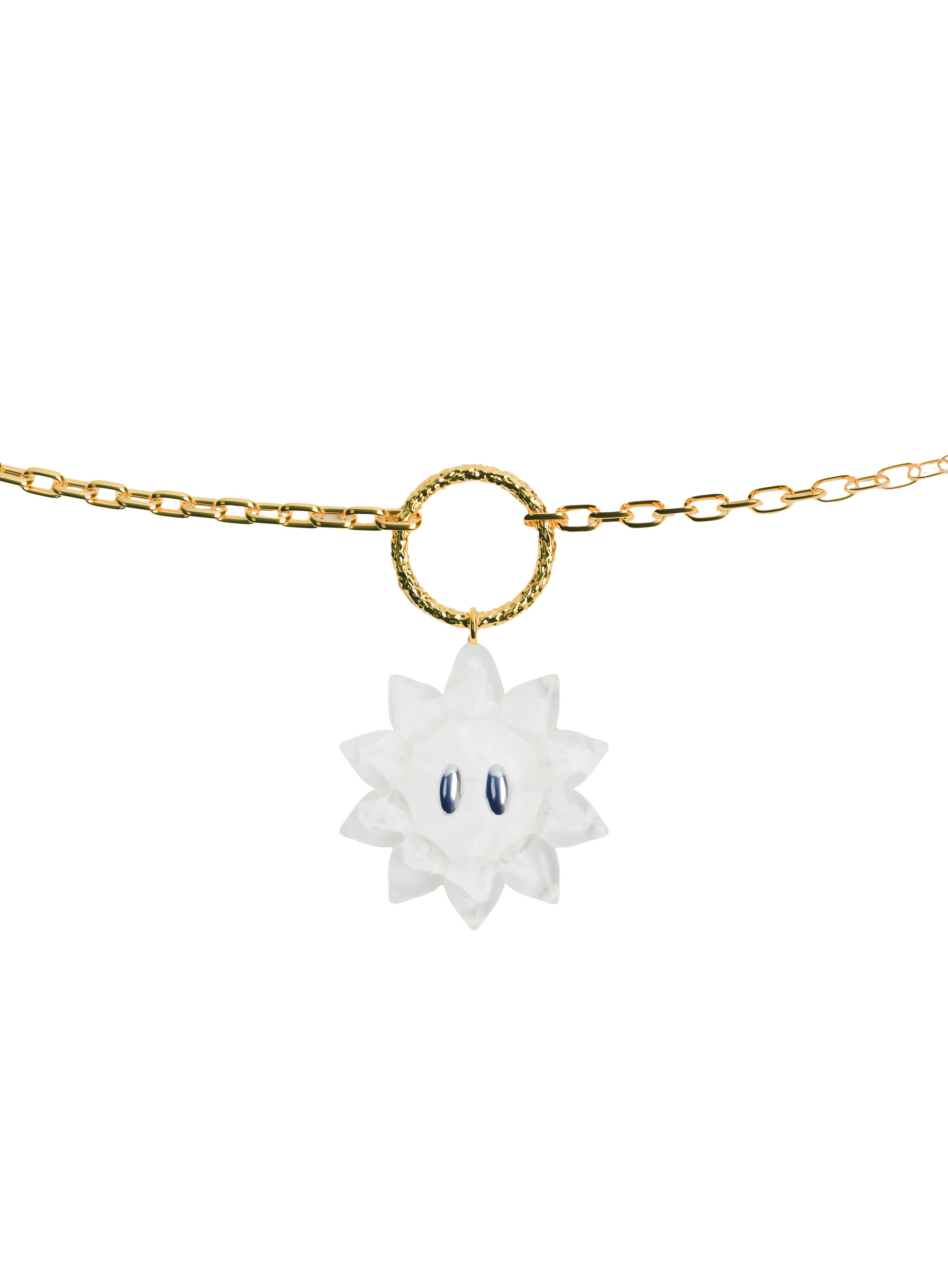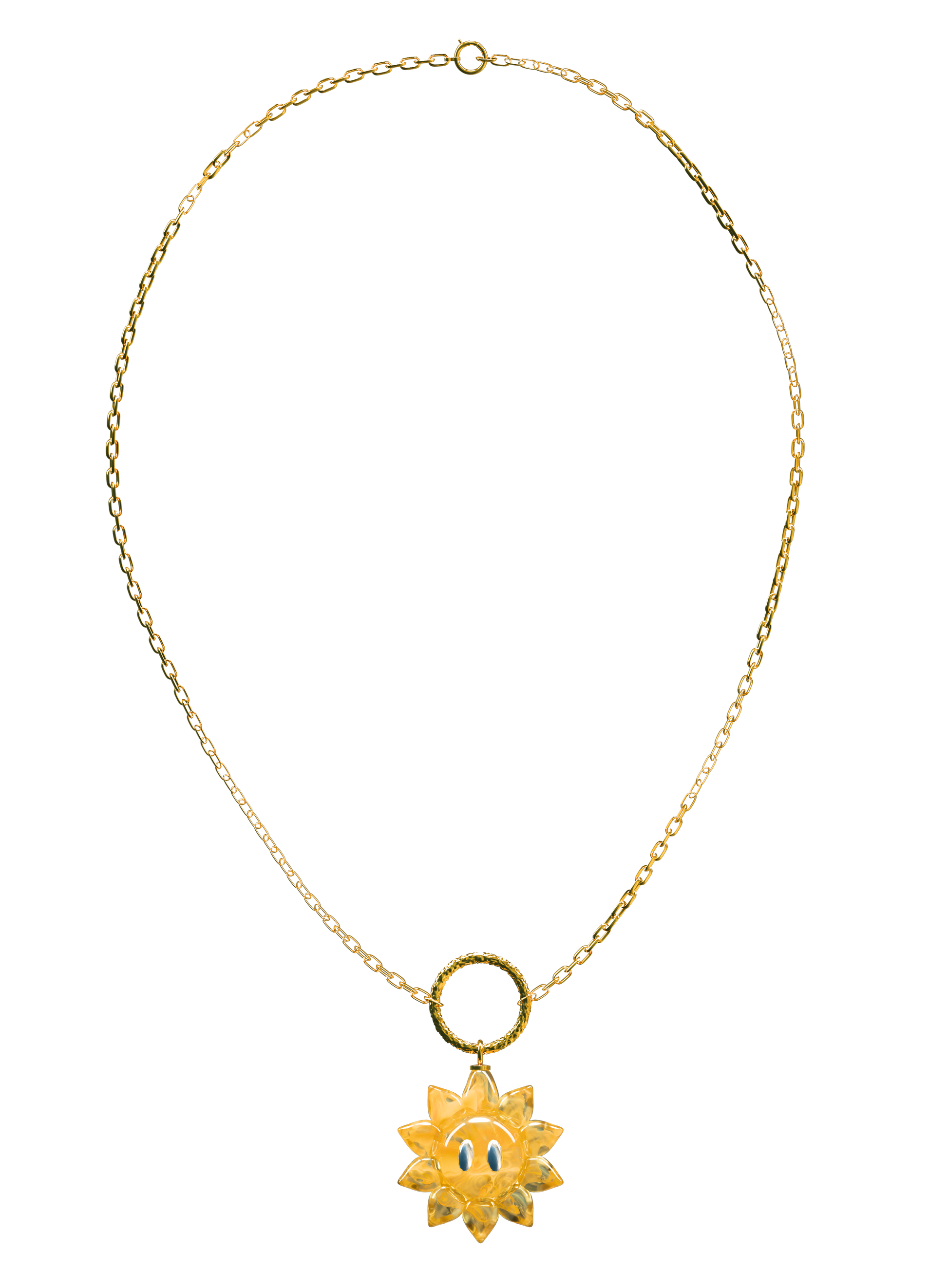 Le collier SUNFLOWER est conçu en argent 925 plaqué or 18 carrat et composé d'une fleur à l'éffigie de la collection en resine epoxy possèdant des paires de yeux en argent 925.