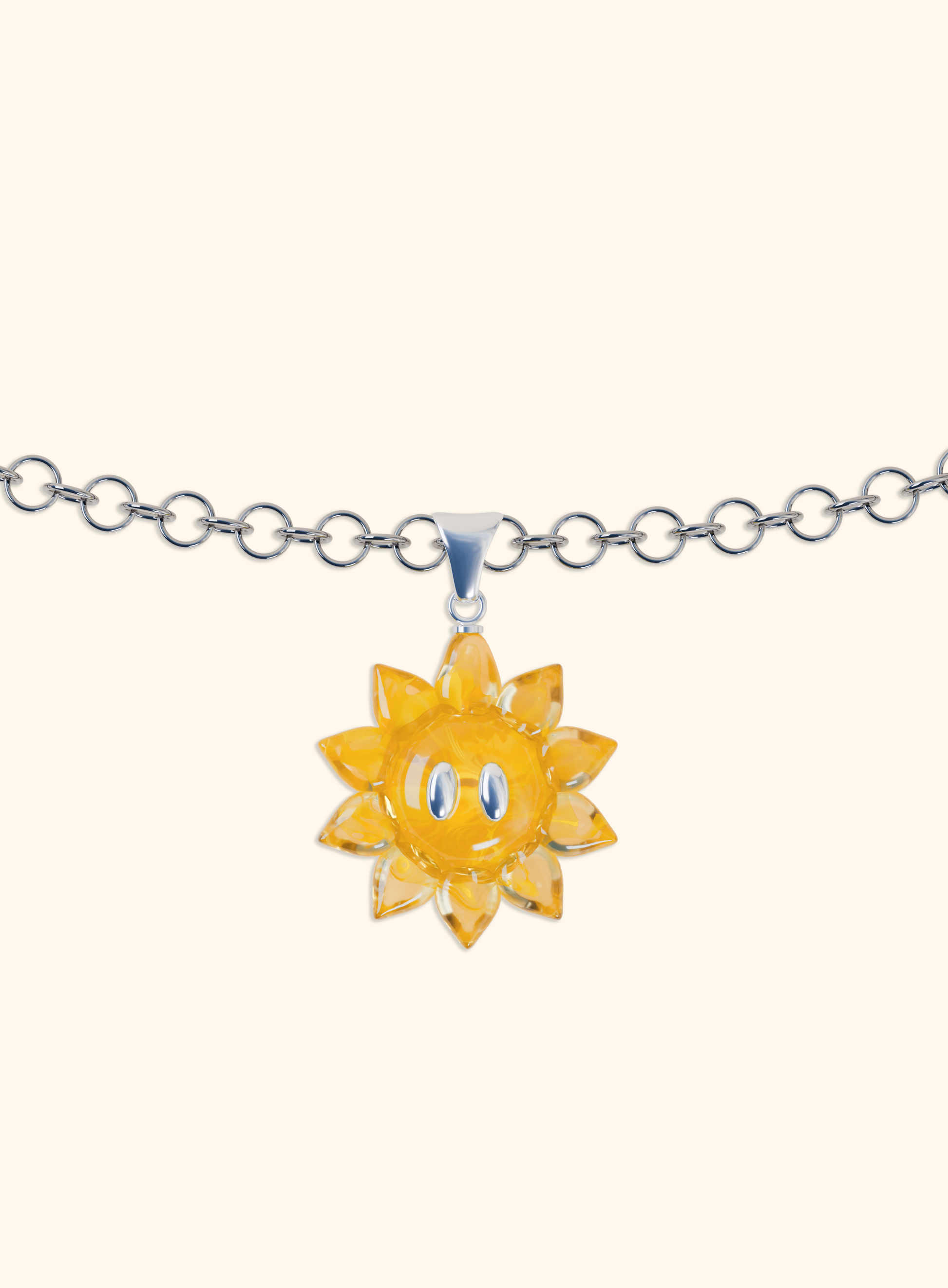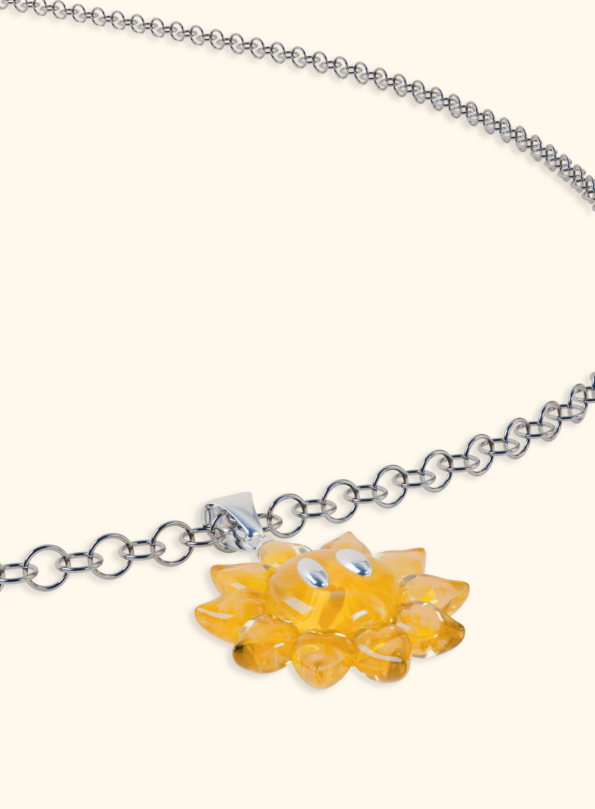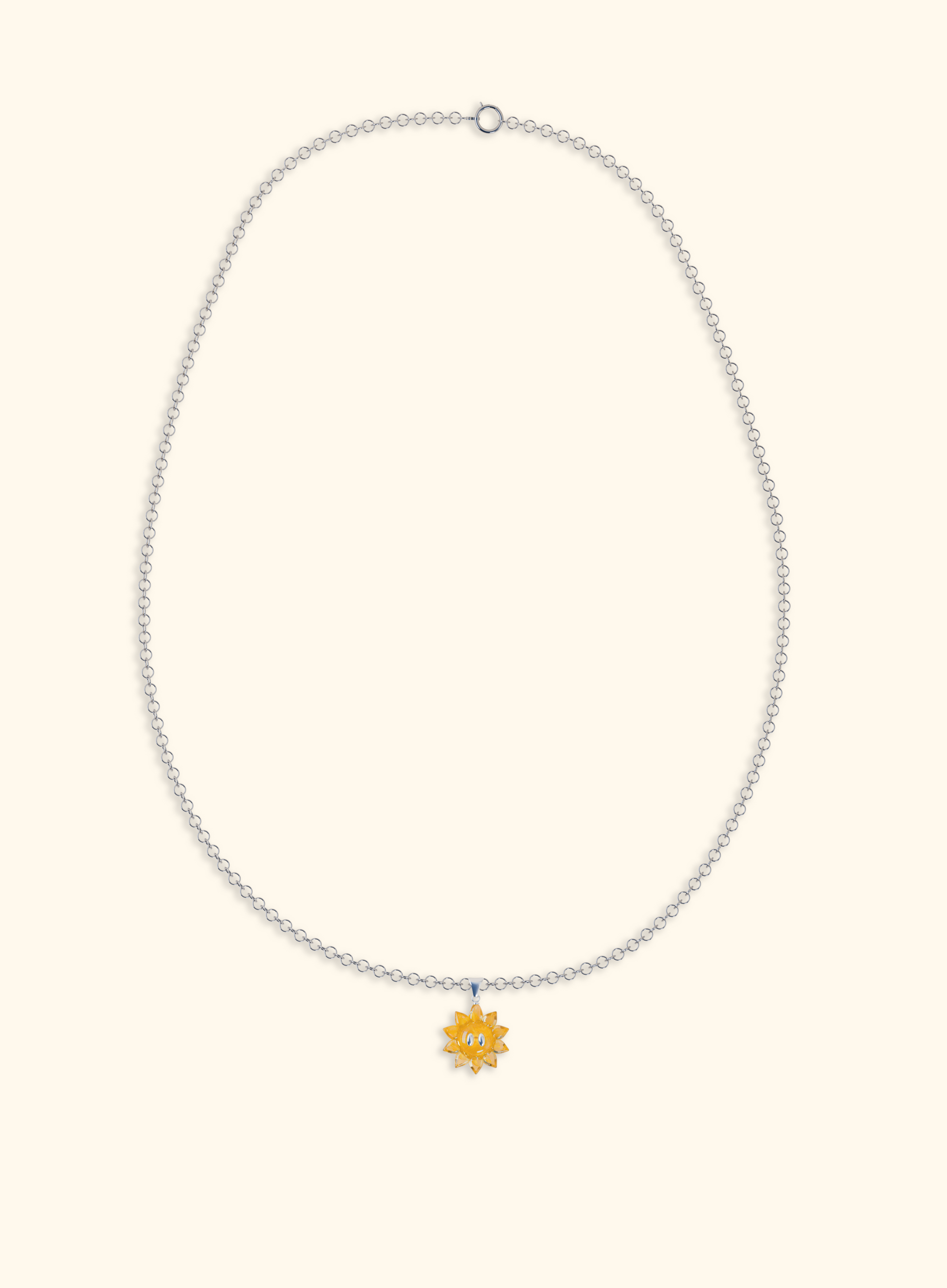 Le collier SUNFLOWER est conçu en argent 925 et composé d'une fleur à l'éffigie de la collection en resine epoxy possèdant des paires de yeux en argent 925.