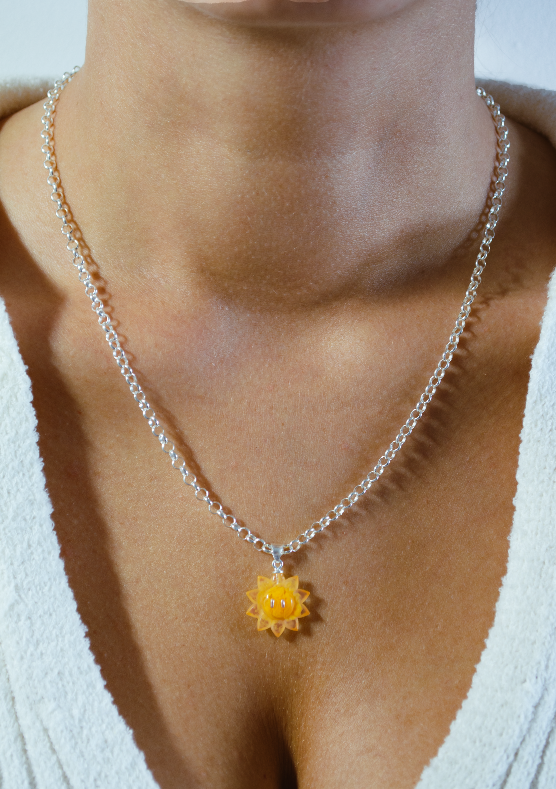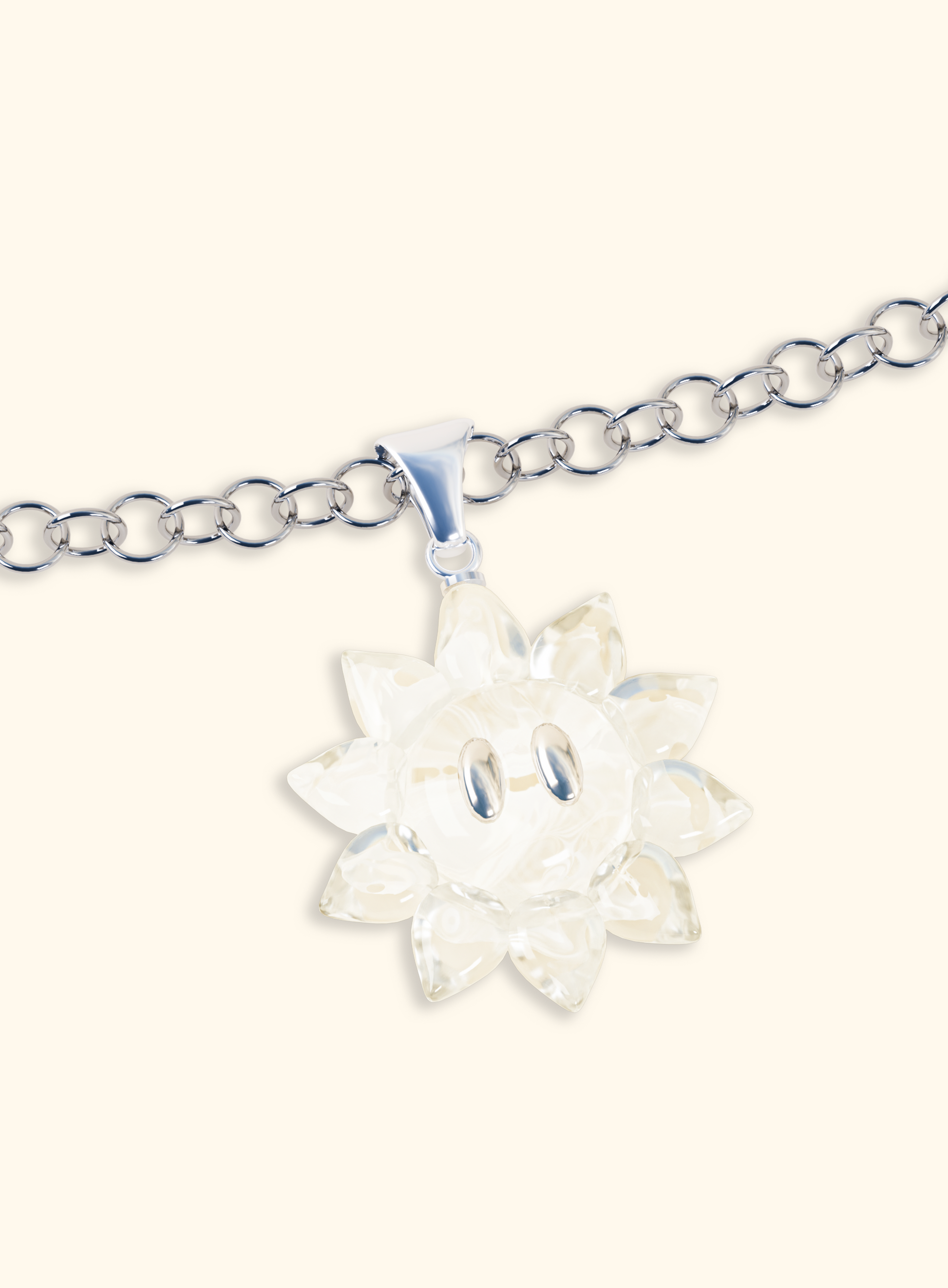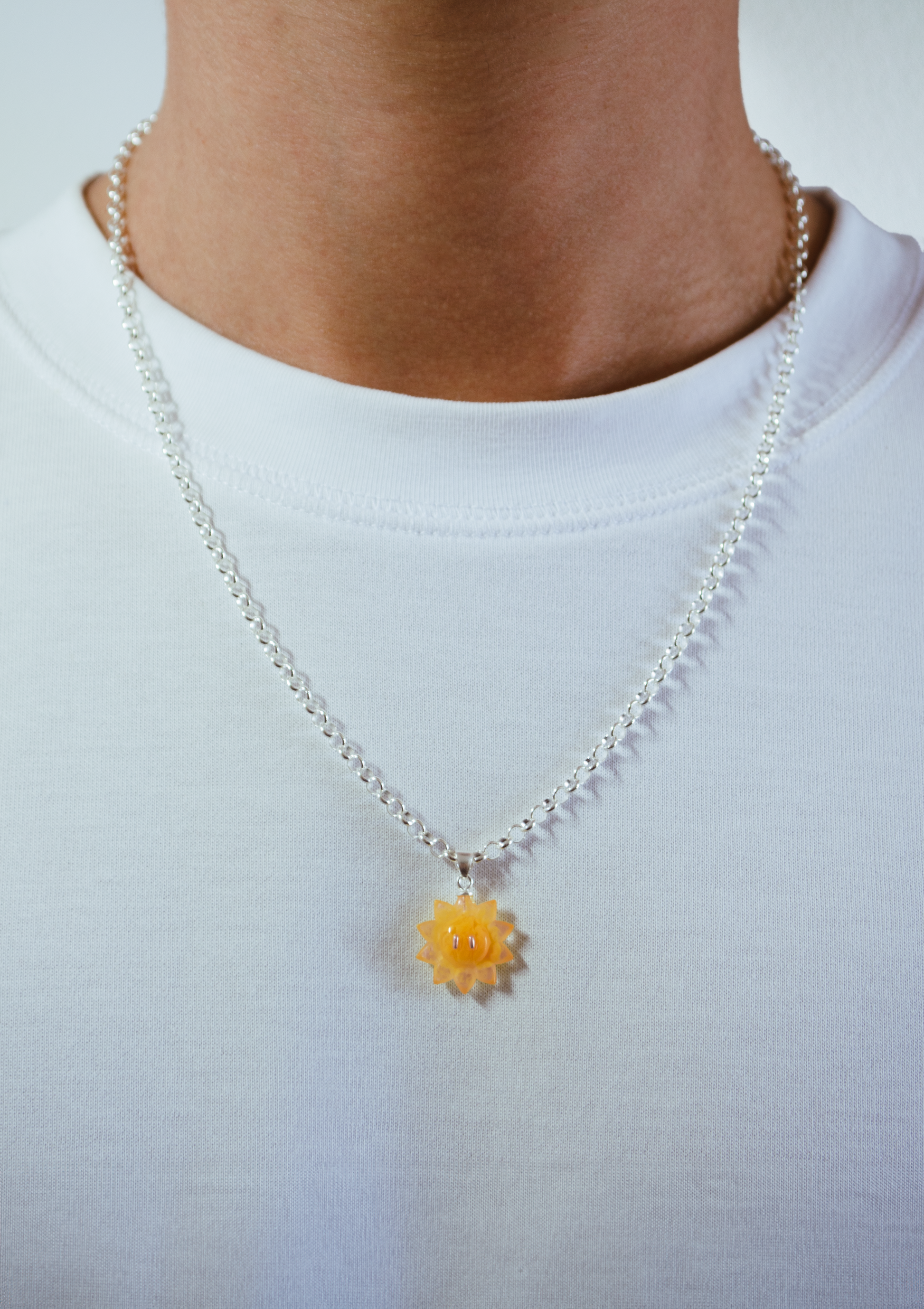 Le collier SUNFLOWER est conçu en argent 925 et composé d'une fleur à l'éffigie de la collection en resine epoxy possèdant des paires de yeux en argent 925.