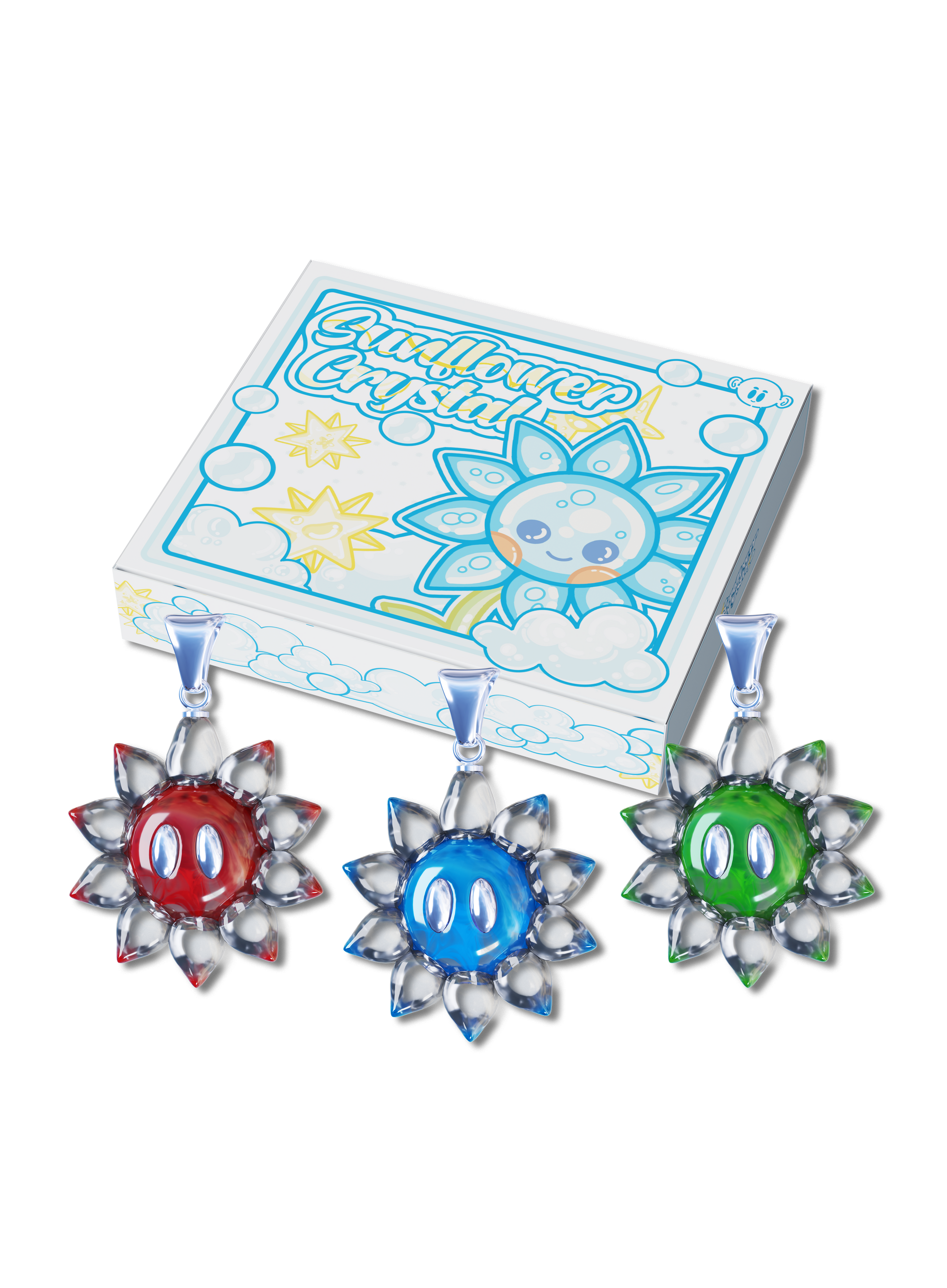 Chaque BlindBox contient 1 collier Sunflower Crystal aléatoire parmi 3 coloris (rouge, vert, bleu) OU le collier SECRET