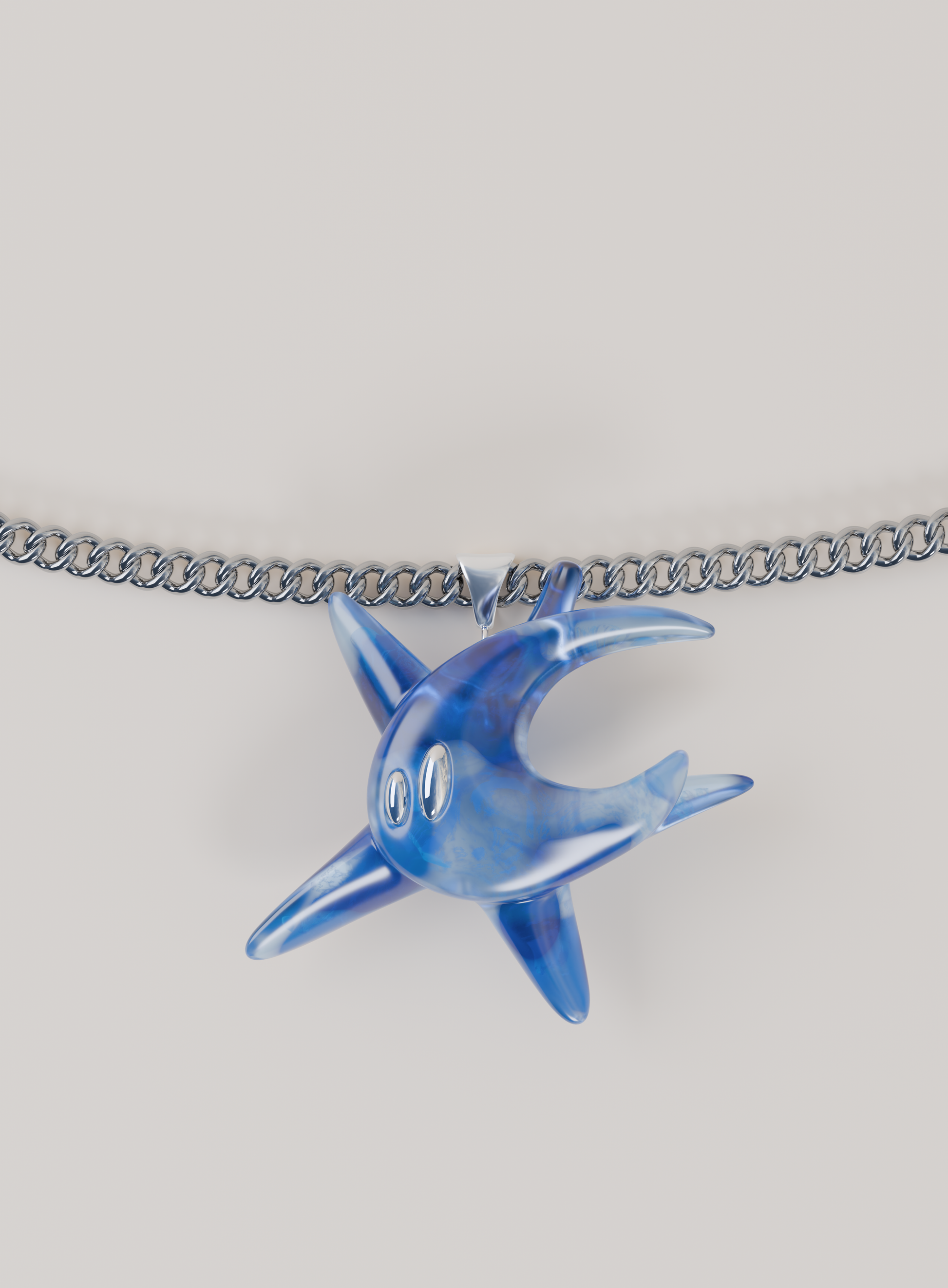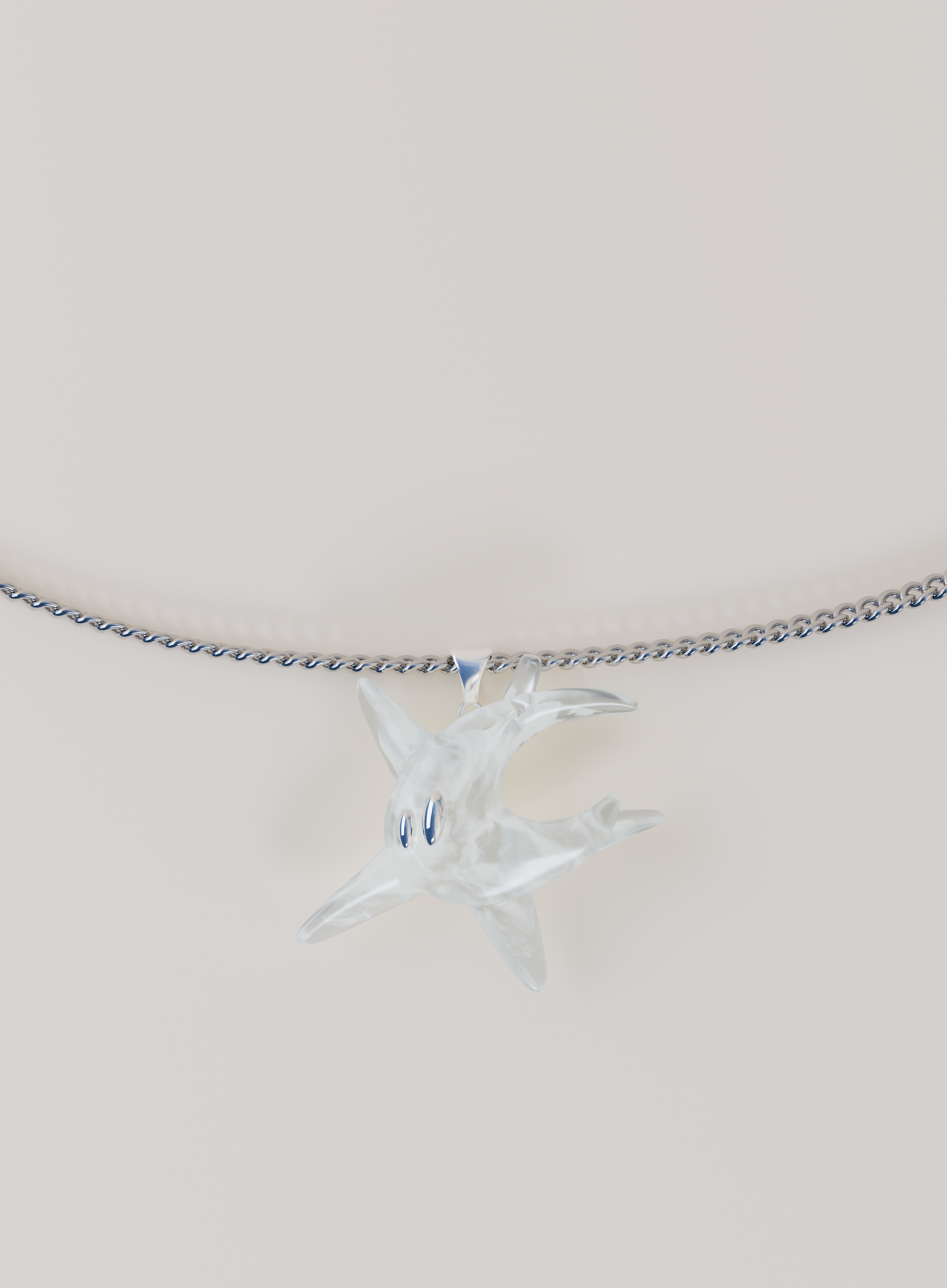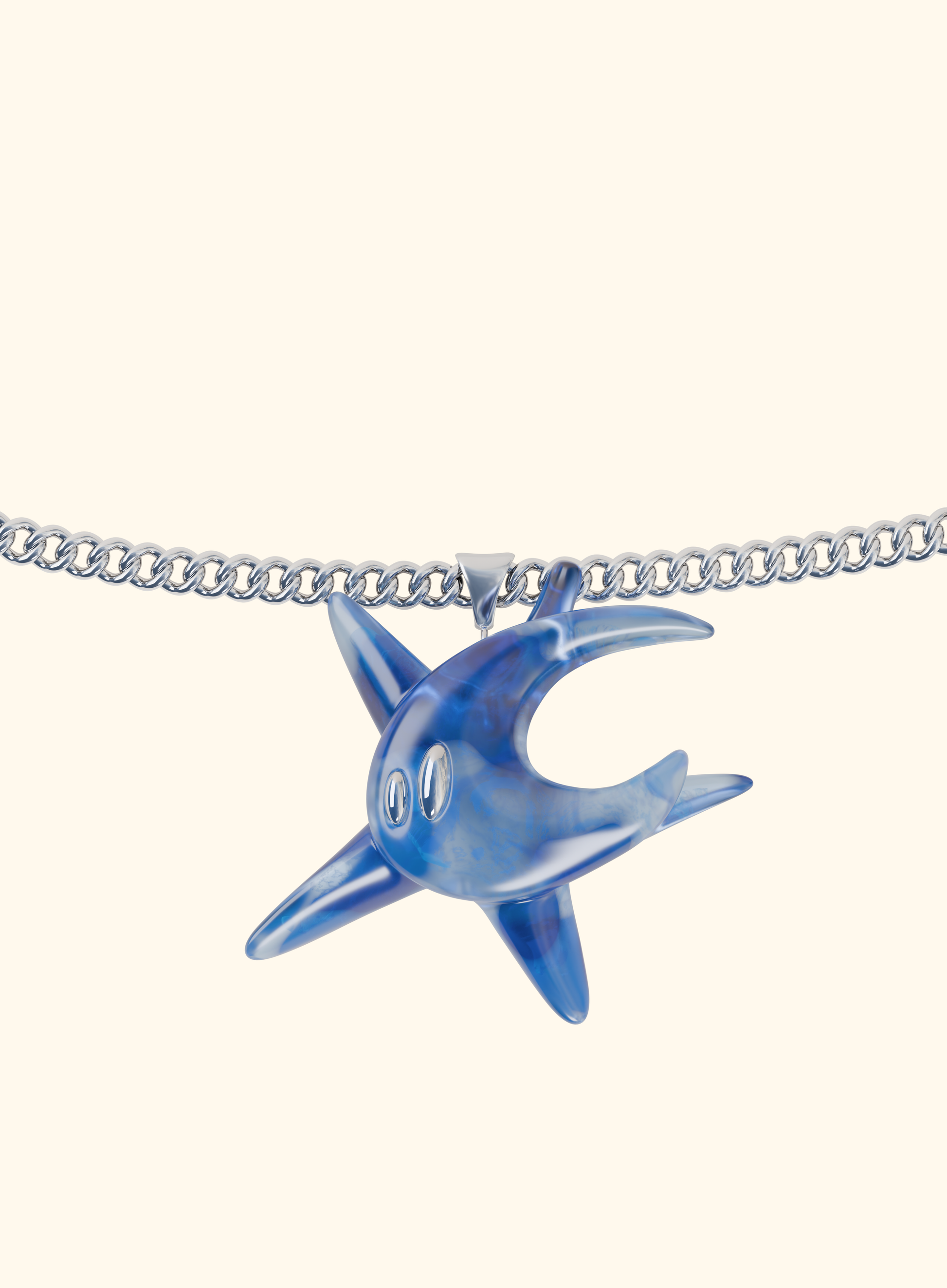 Le pendentif NUIT est conçu en argent 925 recyclé et composé de la fusion d'une lune et d'une étoile à l'éffigie de la collection en resine epoxy possèdant des paires de yeux en argent 925.