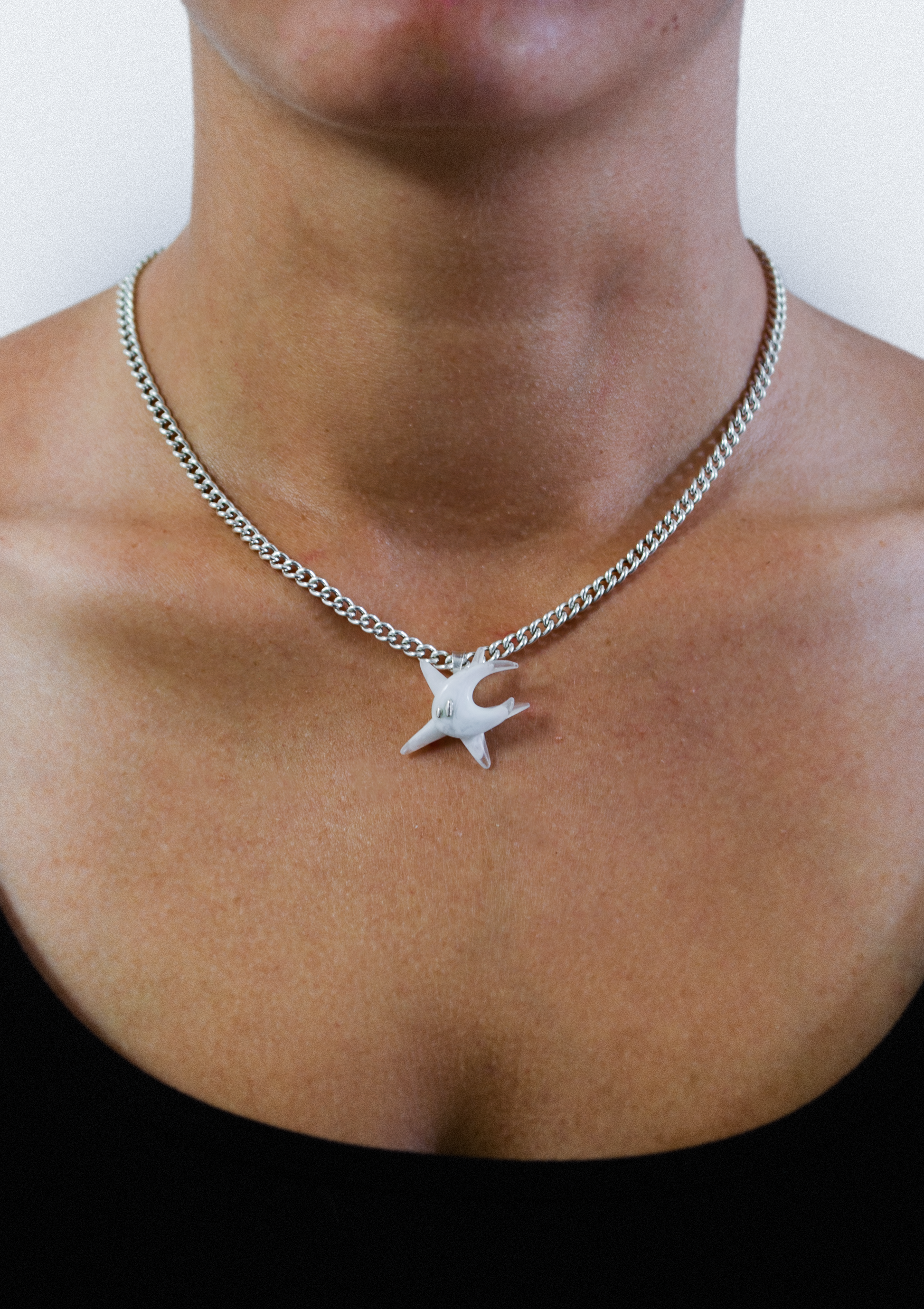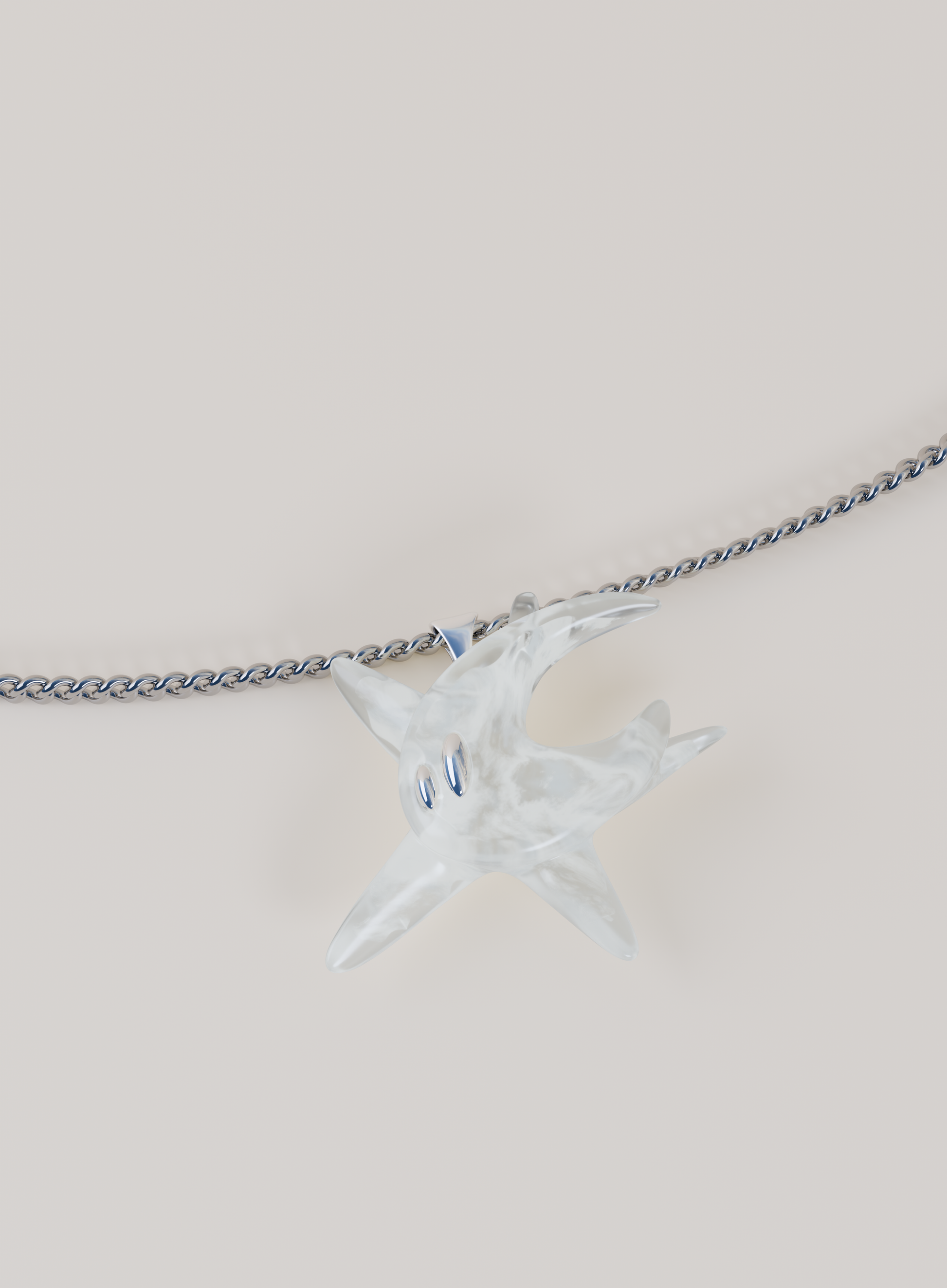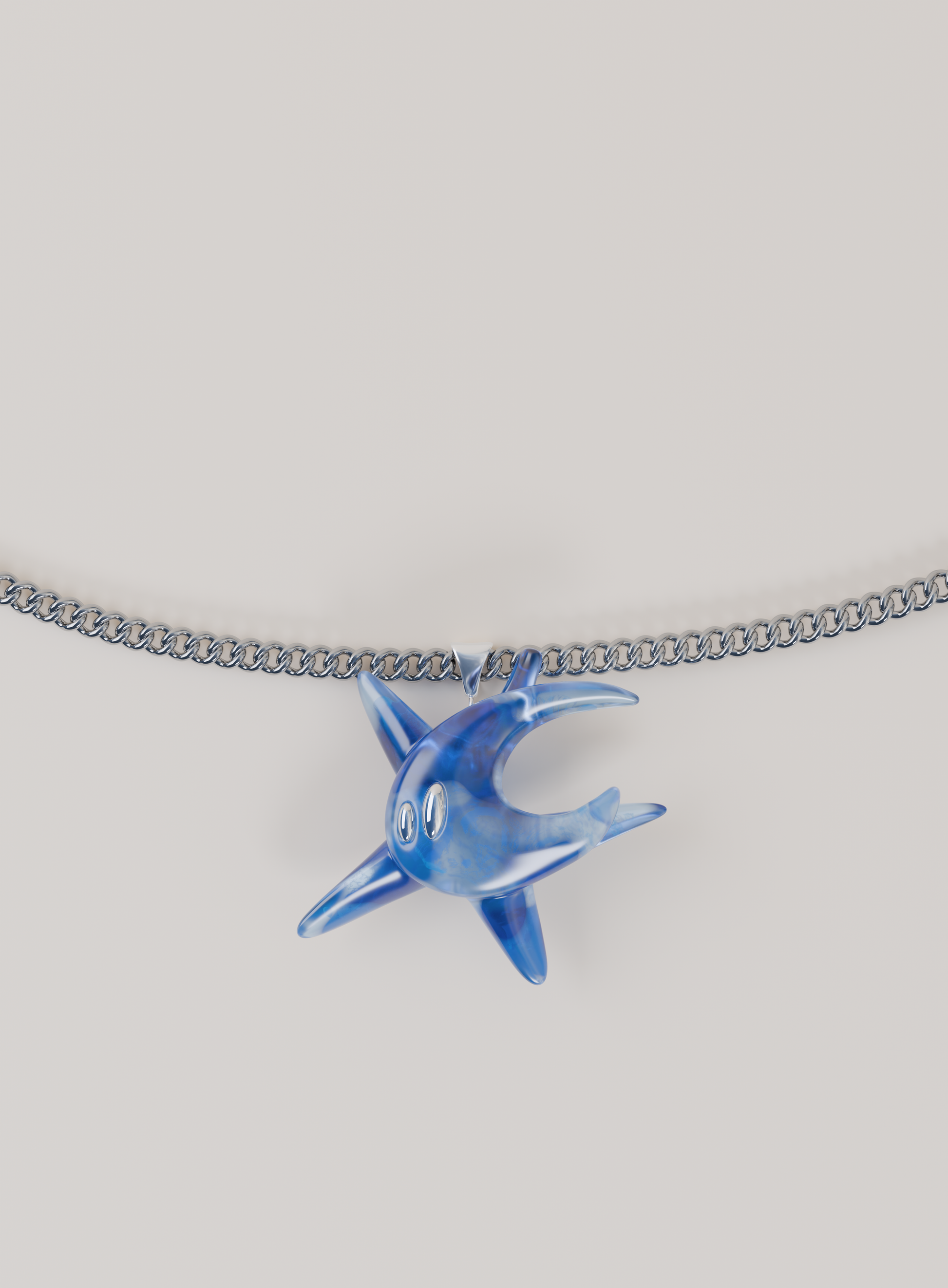 Le pendentif NUIT est conçu en argent 925 recyclé et composé de la fusion d'une lune et d'une étoile à l'éffigie de la collection en resine epoxy possèdant des paires de yeux en argent 925.